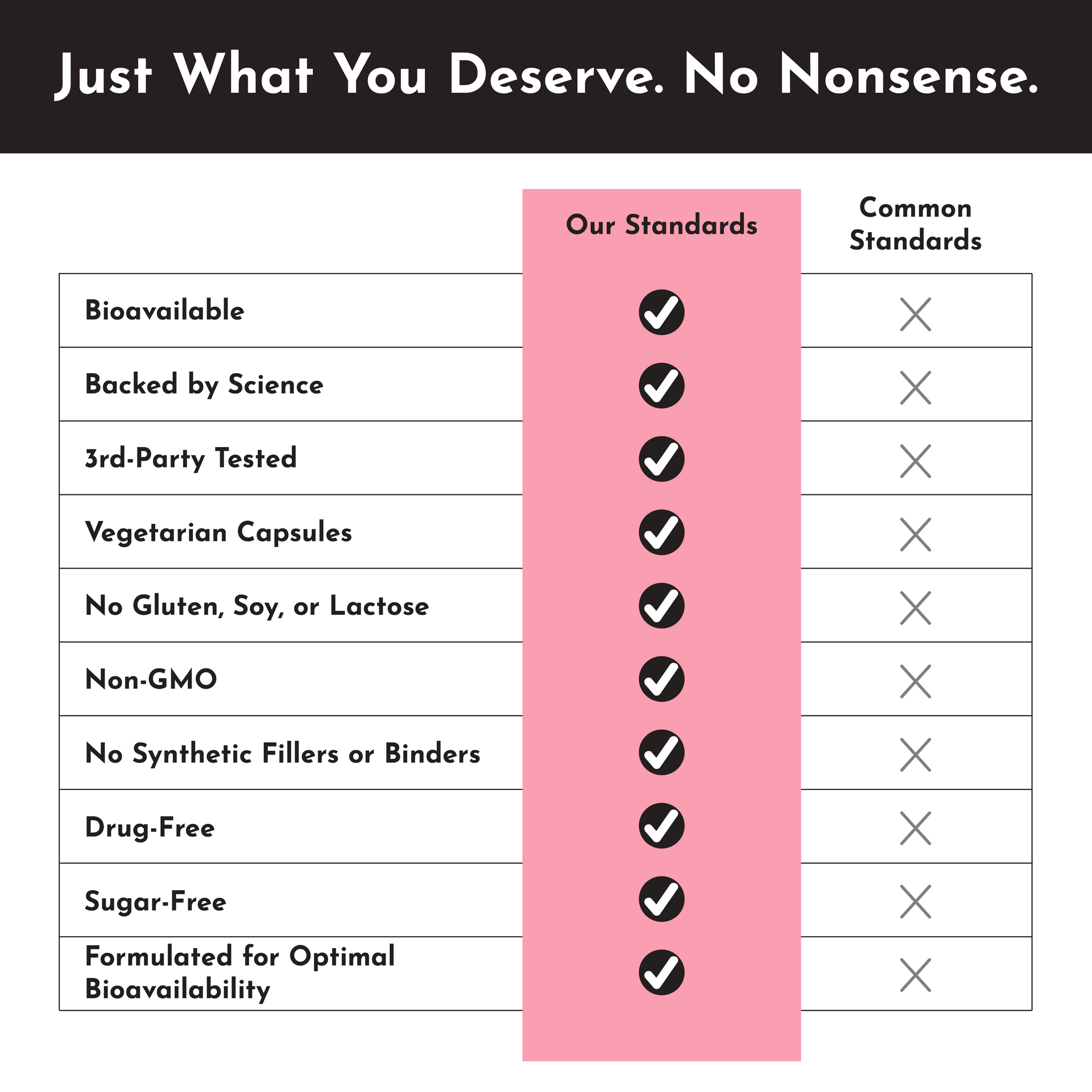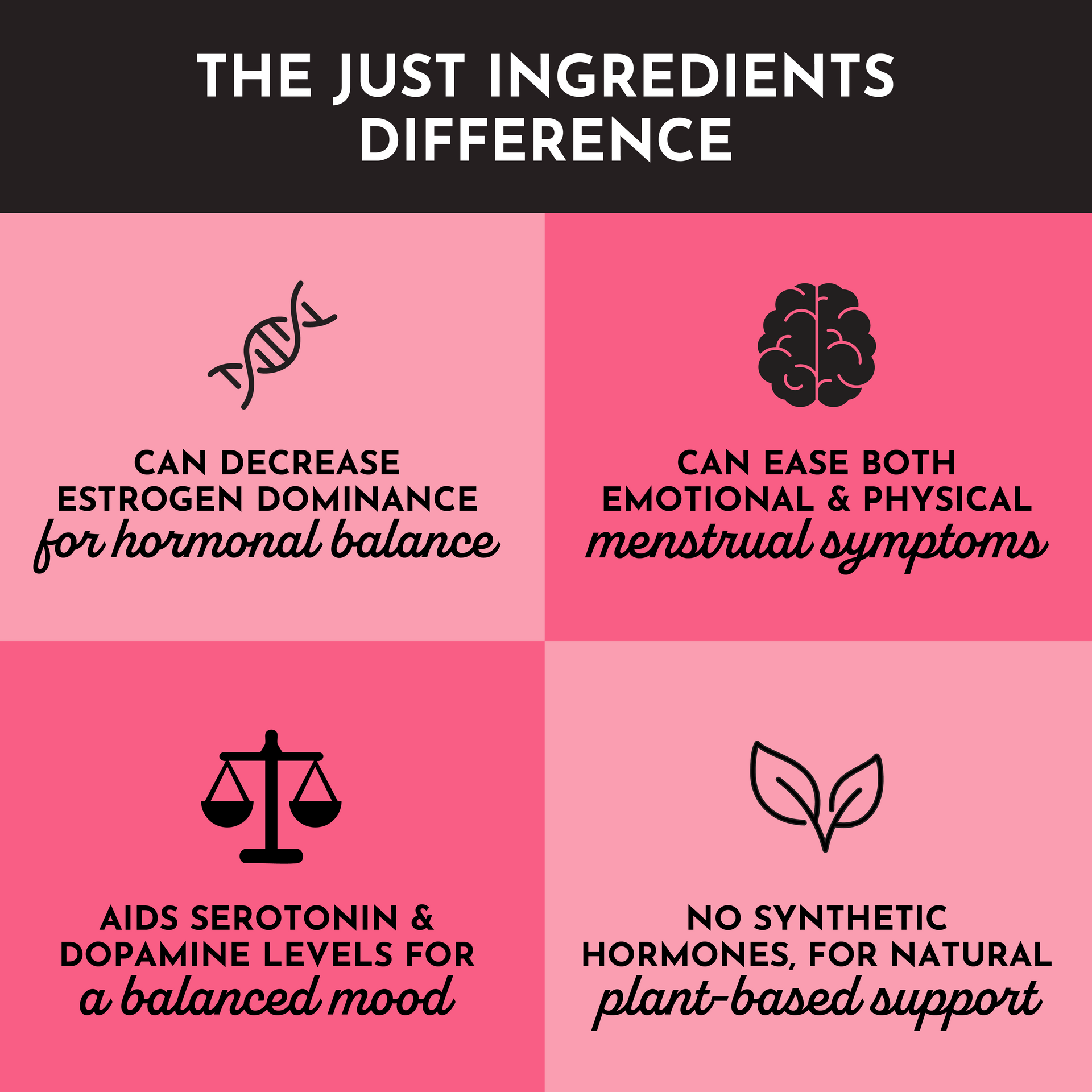 Our formula includes key ingredients like Vitamin B6, which may support hormone balance and contribute to the production of serotonin and dopamine. Additionally, Diindolylmethane (DIM) is included to help promote hormonal harmony. Chasteberry, a plant used for centuries, may support relief from PMS symptoms when taken consistently throughout the cycle.